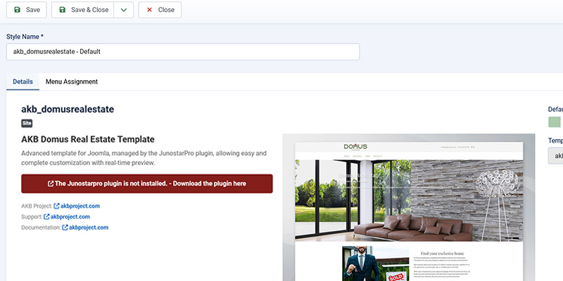 A complete package that includes Joomla 5 already configured with JunostarPro and the AKB template (e.g., Domus Real Estate). Recommended for quickly creating an exact copy of the demo site.