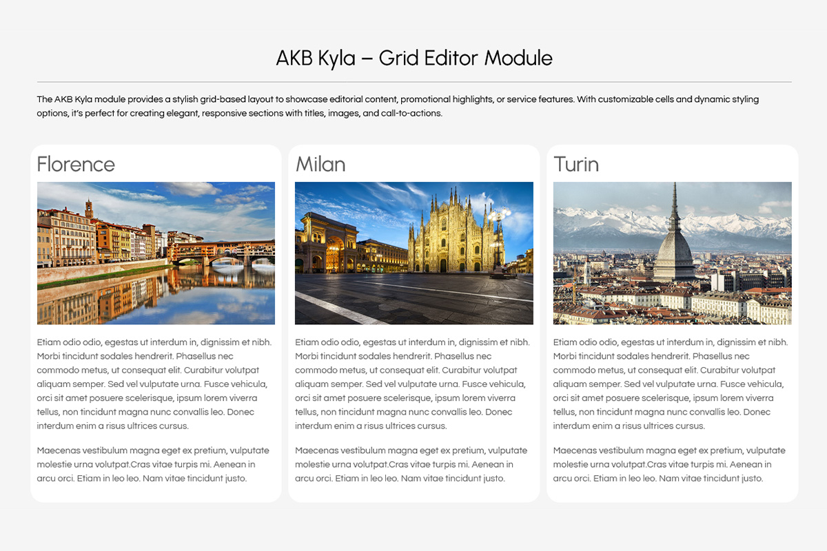AKB Athena is a flexible module designed to offer maximum visual and structural control over content within a Joomla site. Thanks to its smart layout system and support for overlay content, this module is ideal for creating high-impact sections such as headers, featured areas, or promotional banners.
