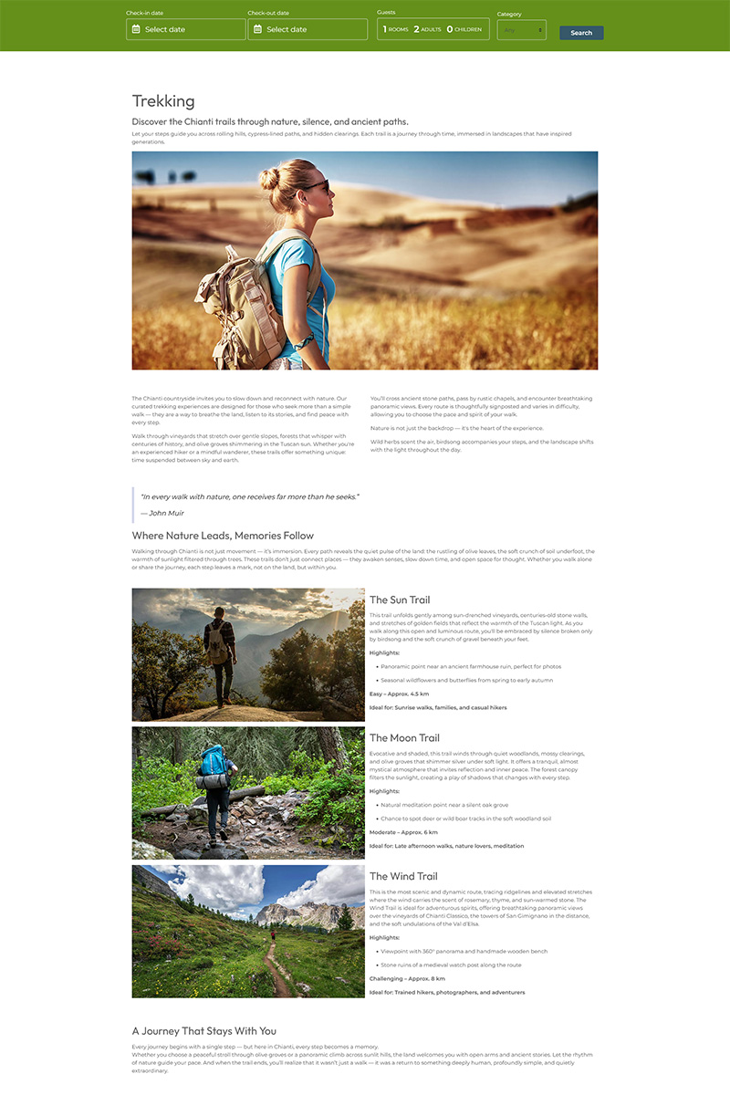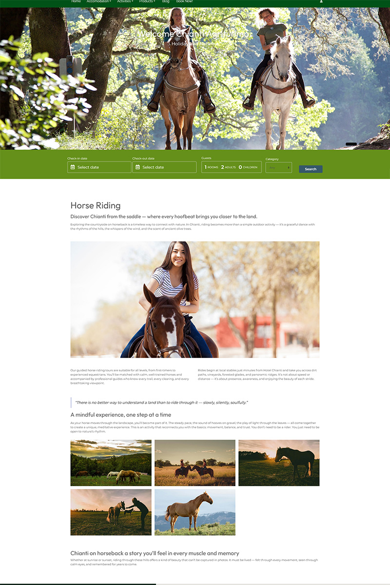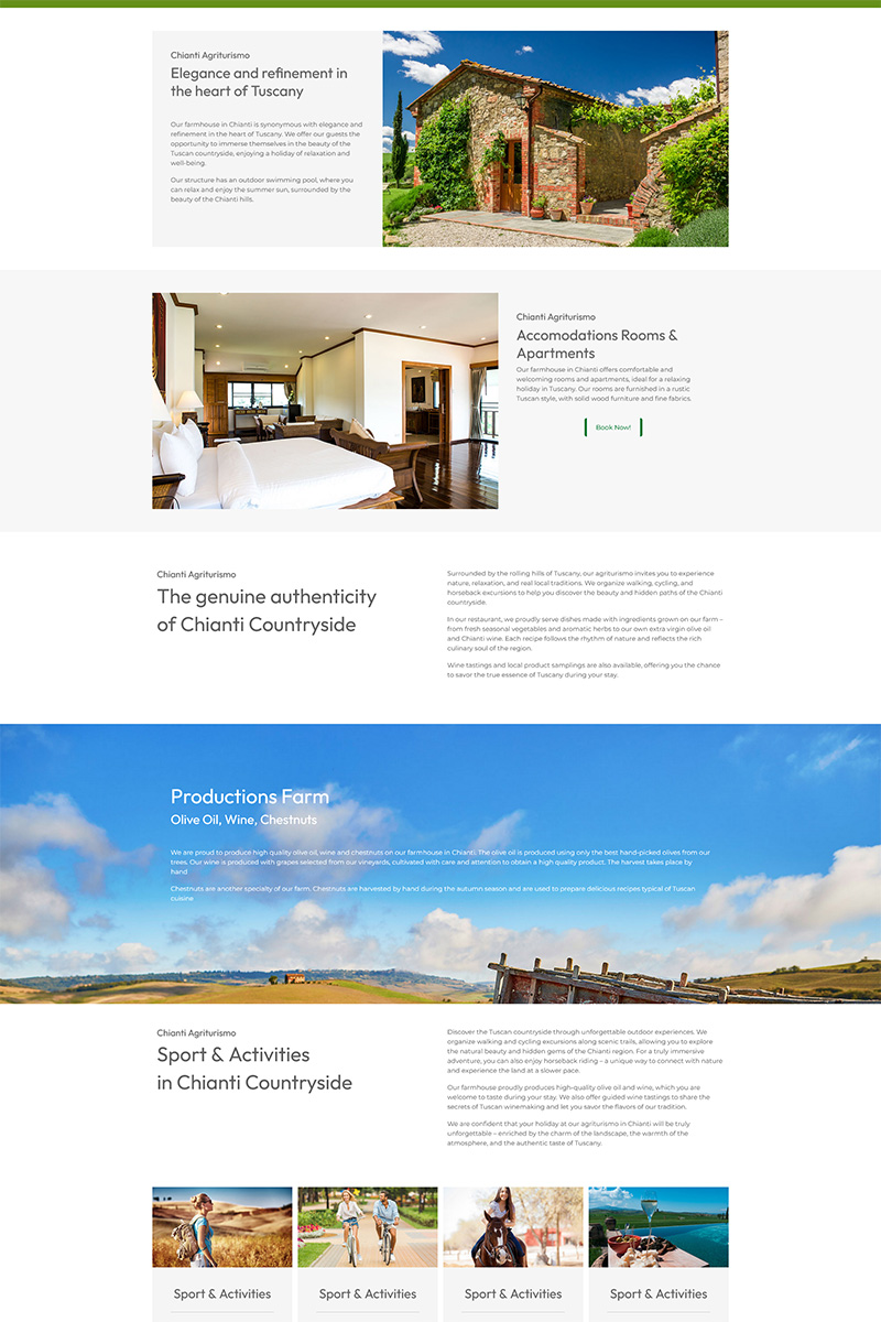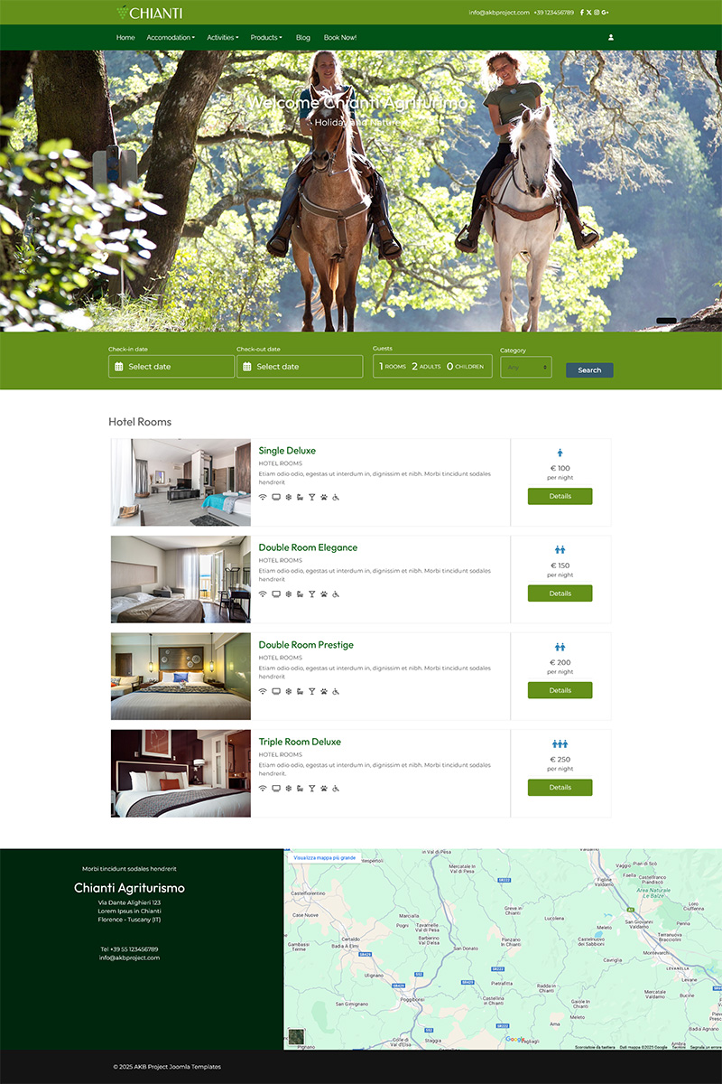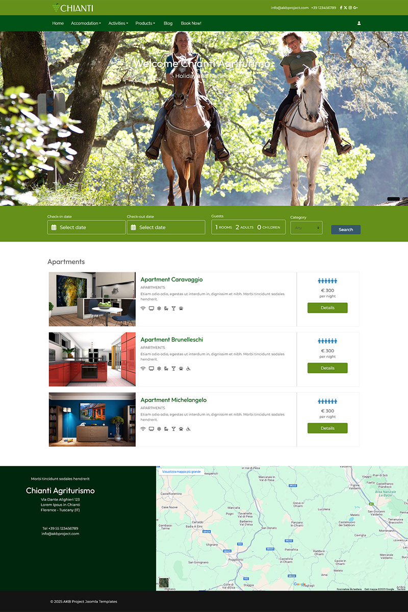 AKB Chianti is a Joomla template designed to create a professional and reliable website for hotels, farmhouses, and any other hospitality business offering accommodation in rooms, apartments, or villas.