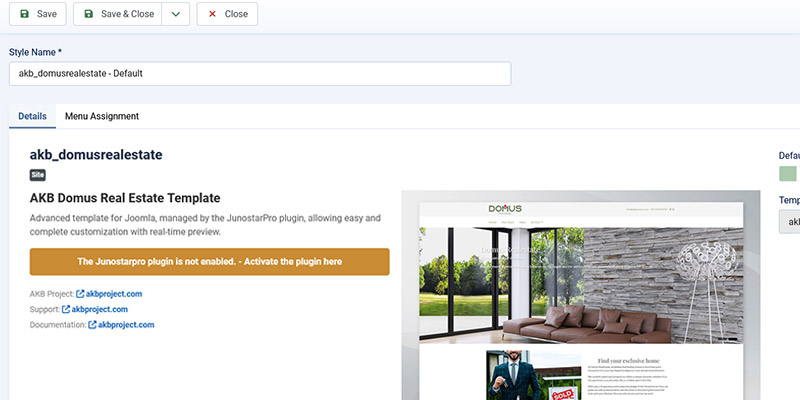 A complete package that includes Joomla 5 already configured with JunostarPro and the AKB template (e.g., Domus Real Estate). Recommended for quickly creating an exact copy of the demo site.