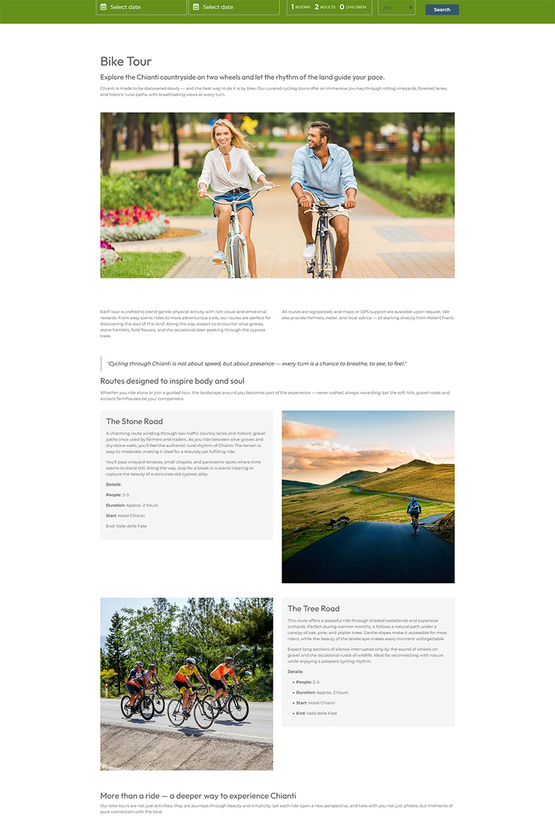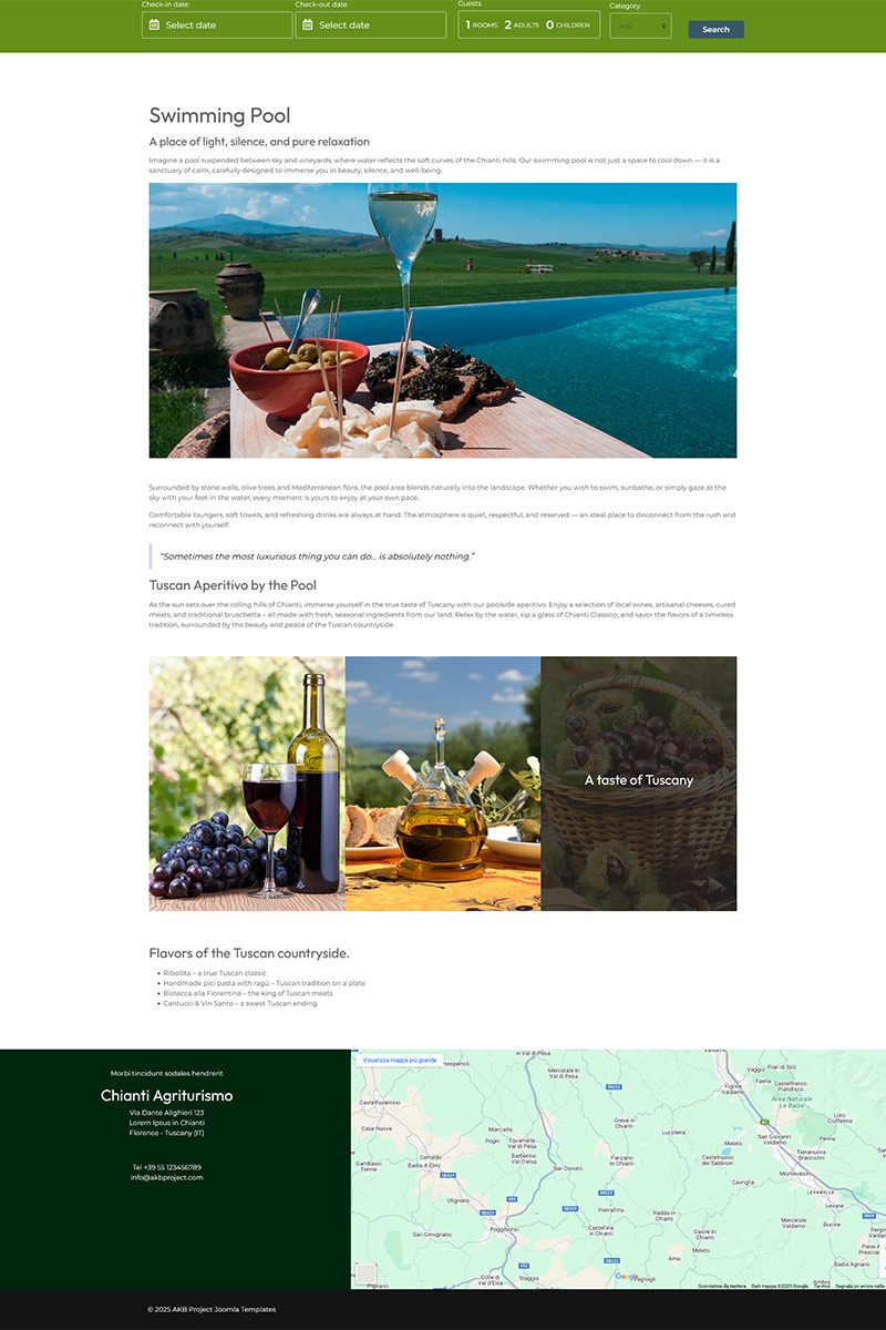 AKB Chianti is a Joomla template designed to create a professional and reliable website for hotels, farmhouses, and any other hospitality business offering accommodation in rooms, apartments, or villas.