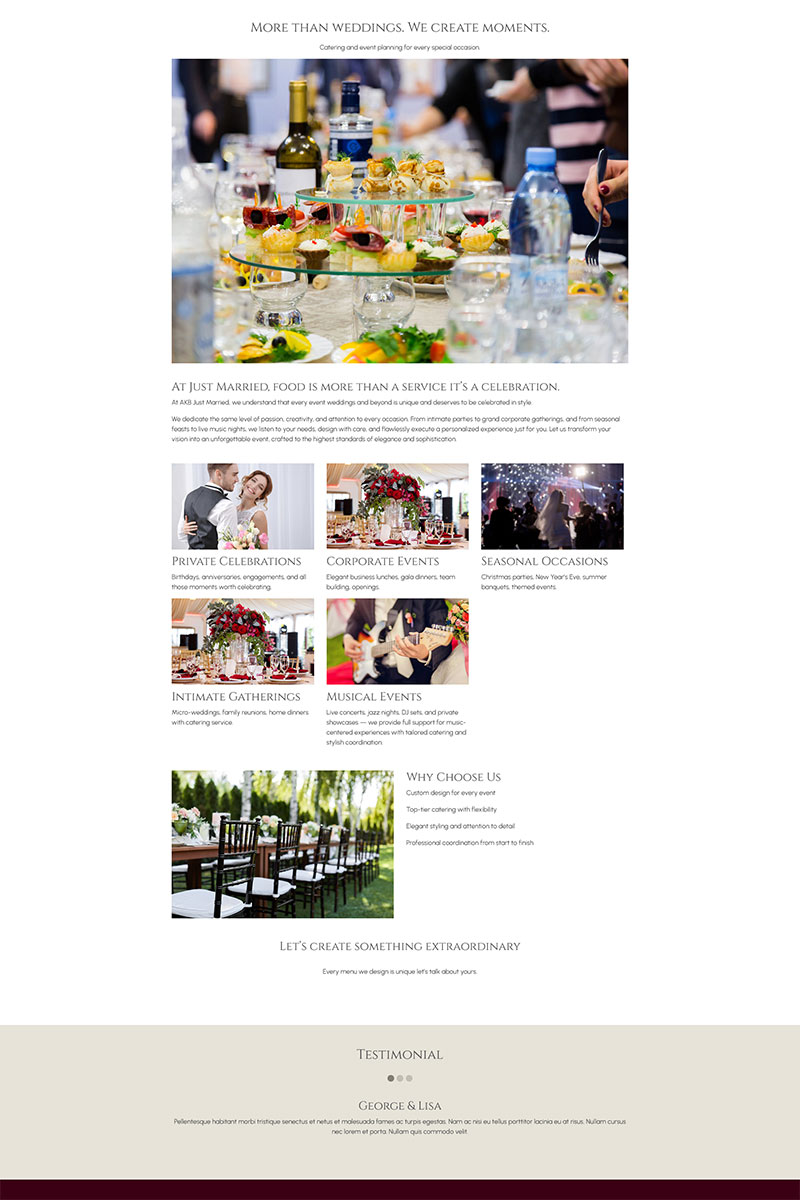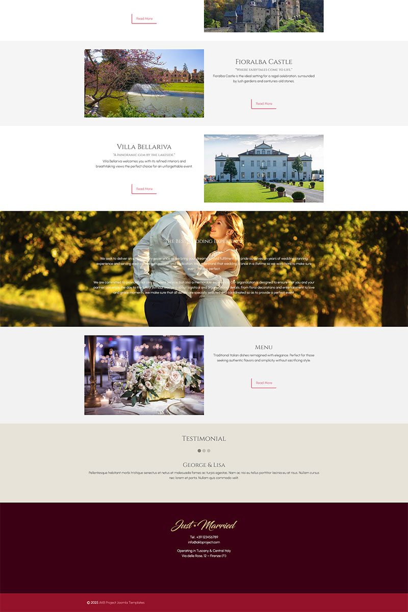 AKB Just Married is a Joomla template ideal for creating an elegant and emotional website for weddings, catering services, and exclusive events. Designed for those who want to showcase their style, venues, and services with class and personality.