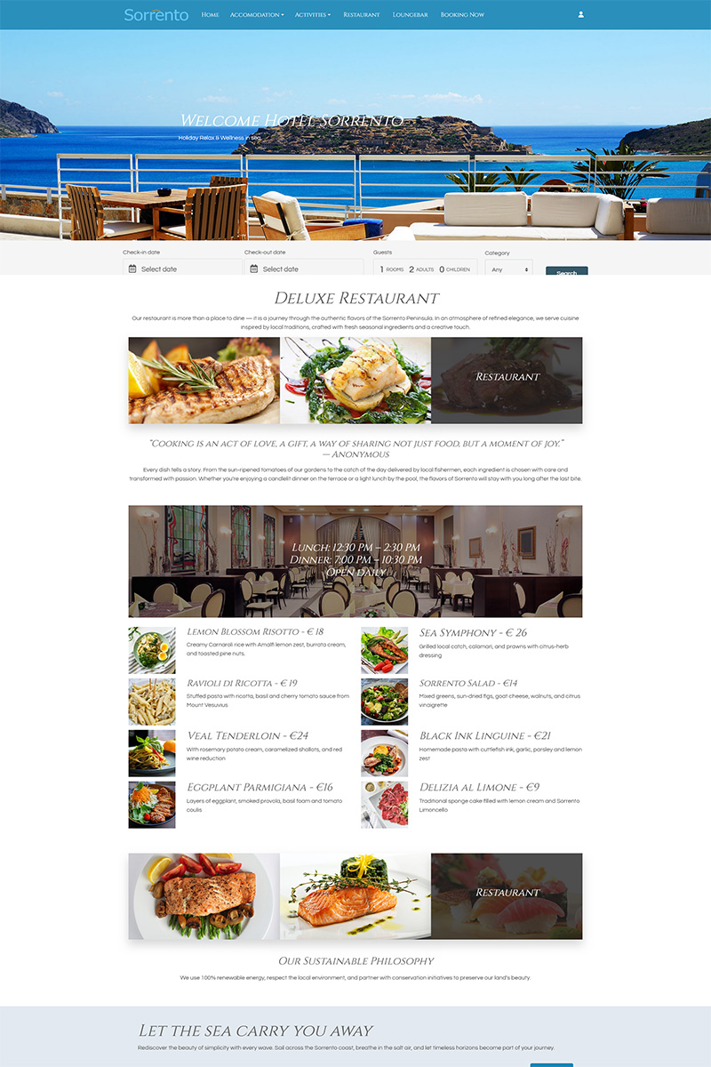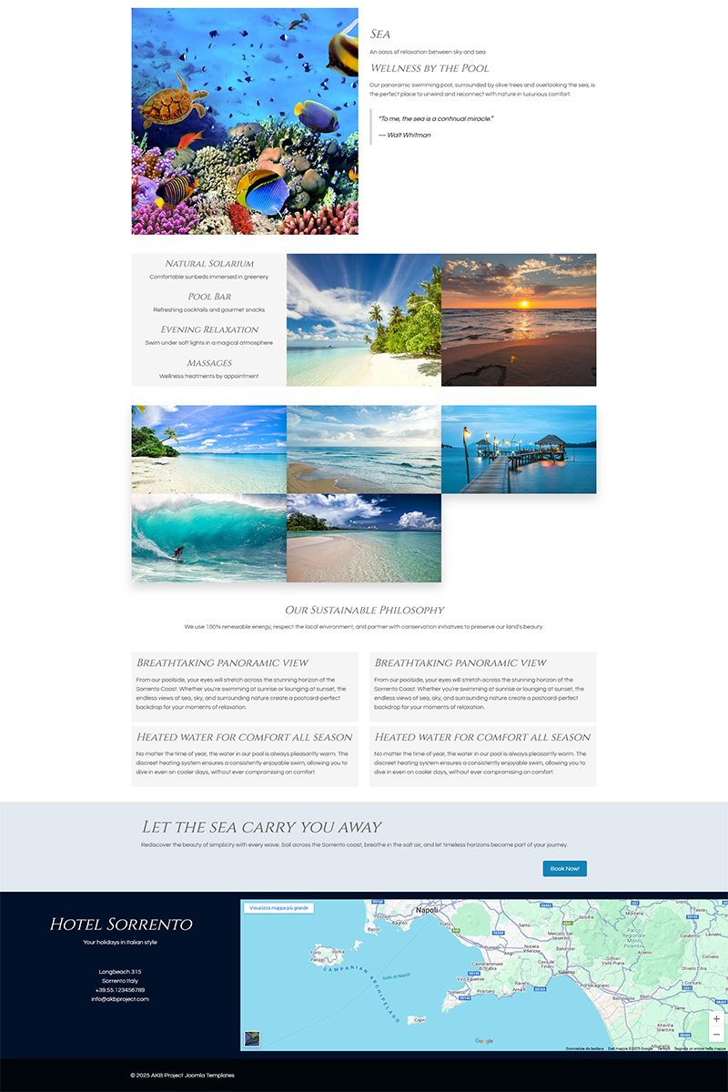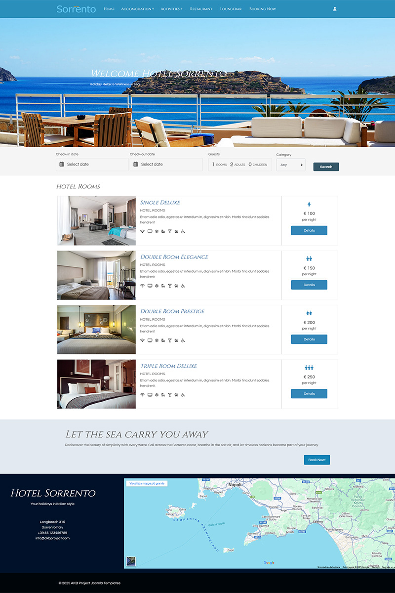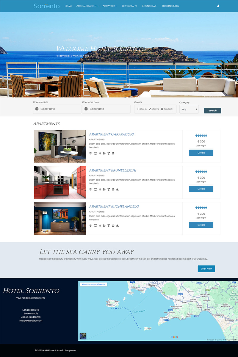 AKB Sorrento is a Joomla template designed to create a professional and reliable website for hotels, farmhouses, and any other hospitality business offering accommodation in rooms, apartments, or villas.